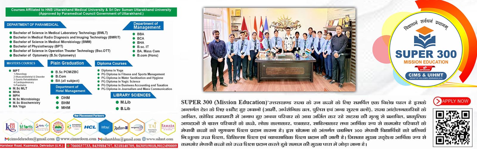 Haridwar road, P.O. Harrawala, Kuanwala, Dehradun, Uttarakhand 248160, an educational society registered under the Indian society registration act 1860. It is a self financing institute in Uttarakhand state attached with 450 bedded multi specialty indoor hospitals. Located in capital city of Uttarakhand, it's serenity and tranquility adds to the pleasure of learningAuxiliary Nursing & Midwifery (ANM) and General Nursing & Midwifery (GNM).